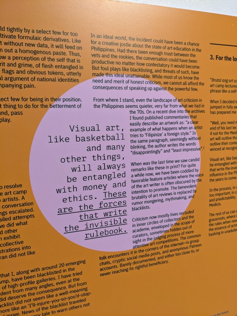 Carla Gamalinda’s essay “Reflections on the Philippine art scene’s manly competitions and dirty plays” included in the exhibition, which can also be read online on Cartellino.