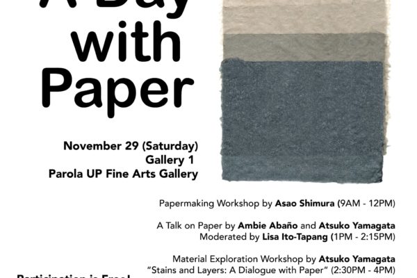 Join us for A Day with Paper, a series of workshops and talk sessions with Asao Shimura, Atsuko Yamagata and Ambie Abaño on November 29 (Saturday) at Parola UP Fine Arts Gallery.